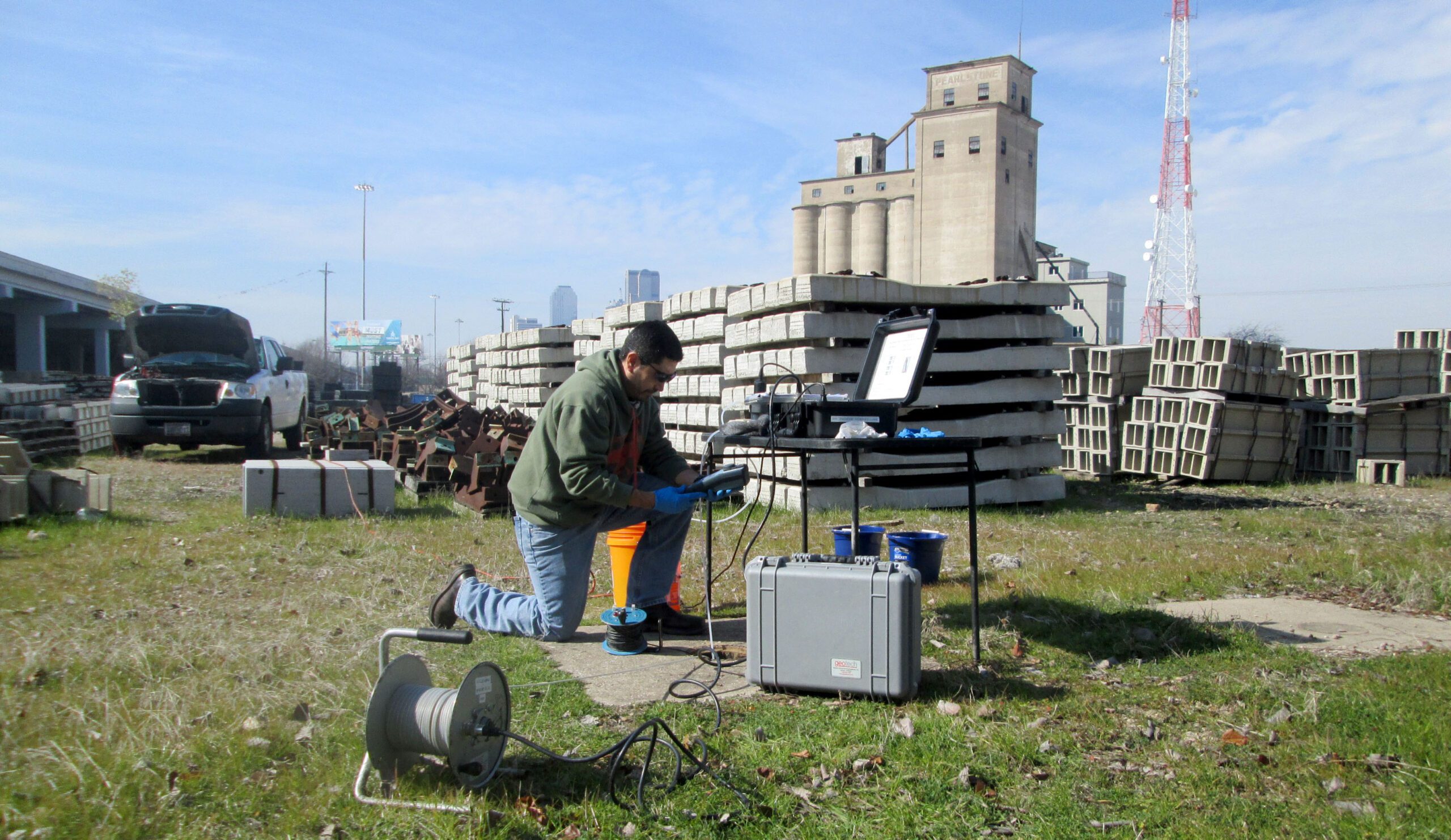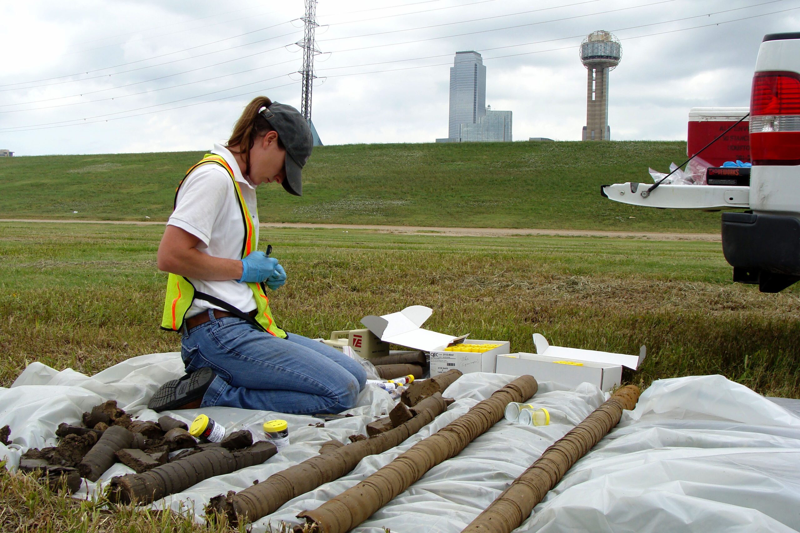 Soil samples are collected during installation of a groundwater monitor well near downtown Dallas.